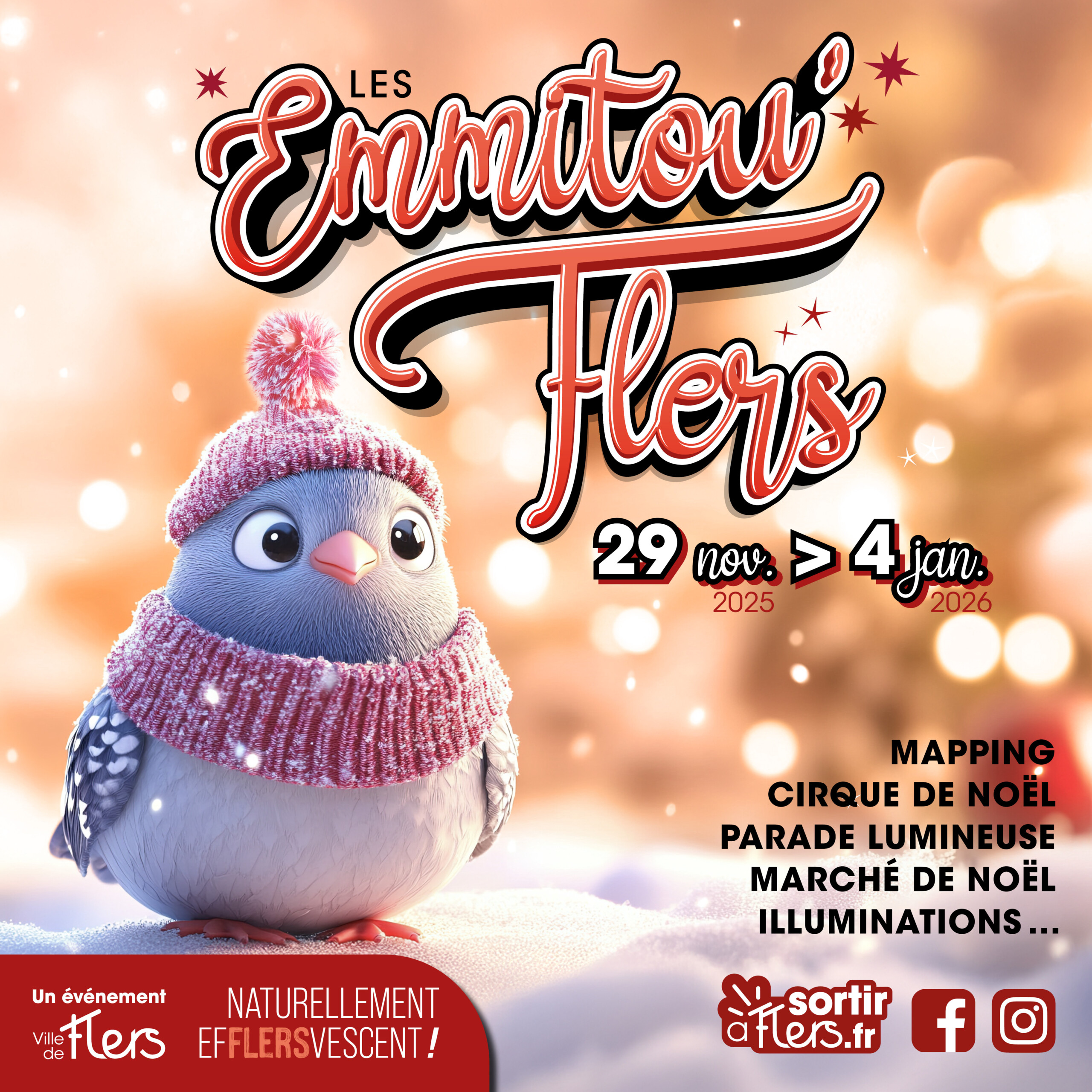 Du samedi 29 novembre 2025 au dimanche 4 janvier 2026, le centre-ville de Flers s’illumine et s’anime pour une nouvelle édition de « Les Emmitou’Flers ». Un mois complet de fêtes, d’animations et d’émerveillement pour petits et grands — idéal pour une escapade féerique au cœur de nos Montagnes de Normandie.