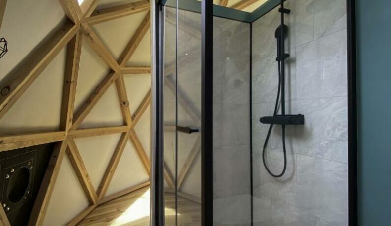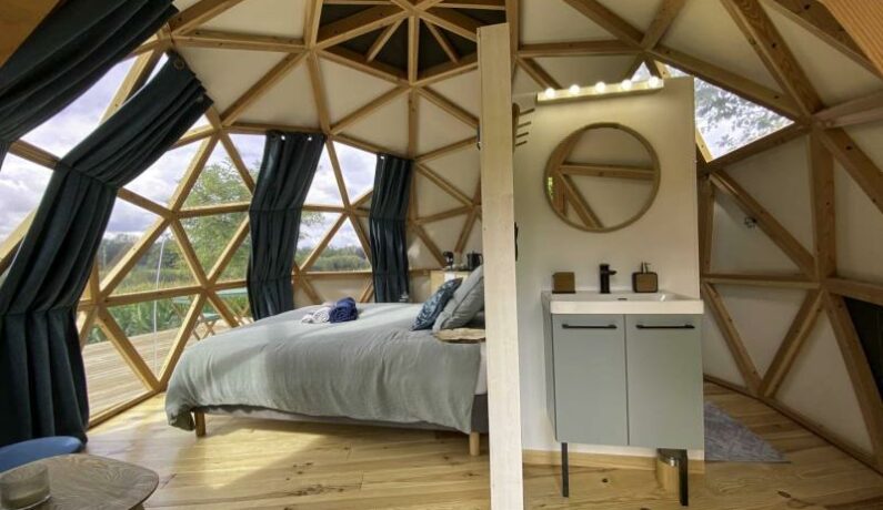 Dôme insolite à ossature bois de 20 m², en toile et isolé en laine : lit 2 personnes 160 x 200 cm, bouilloire et machine à café, lit bébé sur demande, lavabo, cabine de douche et wc. Terrasse en bois surélevée avec spa spa fermé du 1er novembre au 1er avril. Réseau 4G. Chauffage par climatisation réversible. Formule tout inclus avec draps, linge de toilette et petit déjeuner. Table d’hôtes en option uniquement sur demande. Jardin commun des propriétaires partiellement clos, avec très gentil et très discret chien de race Golden Retriever.