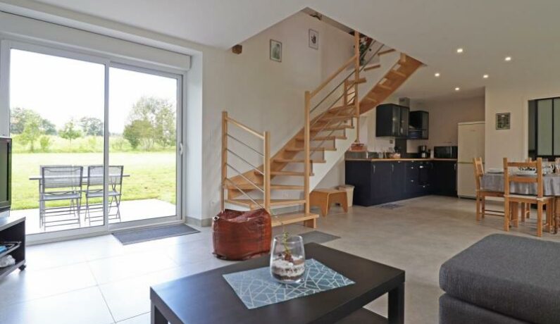 Maison de pays indépendante au sein d’une propriété de 1 ha commune avec les propriétaires, avec chauffage électrique et bois inclus. Rez de chaussée : séjour avec espace salon (TV, poêle) et cuisine entièrement équipée, wc indépendant. Etage mansardé : chambre (lit fait 2 personnes 140 x 190 cm, bureau) avec escalier extérieur, chambre (2 lits faits 1 personne 90 x 190 cm), salle d’eau avec cabine de douche et wc. Garage à vélos ou motos. Bac à sable et jeux extérieurs pour enfants. Jardin arboré non clos avec mare.