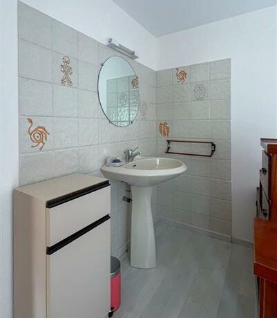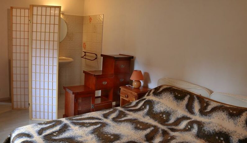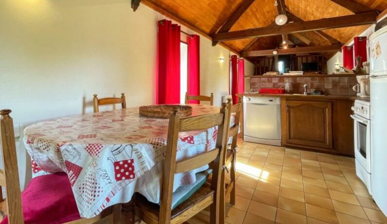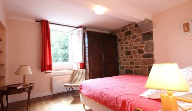 Maison de pays semi-indépendante. En rez-de-jardin : entrée (laverie), 1 chambre (2 lits 1 personne en 80 cm jumelables, lavabo). 1er demi-étage : salle d’eau avec wc, 1 chambre (2 lits 1 personne en 80 cm jumelables). 1er étage : séjour avec coin cuisine. 2ème demi-étage : 1 chambre (1 lit 1 personne). Chauffage électrique, accès à jardin commun de 800 m². DRAPS FOURNIS.