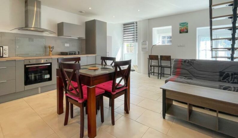Maison récemment remis à neuf, offrant une bonne luminosité qui comprend : – au RdC : Salon/Salle à manger (avec TV & BZ convertible en 2 couchages : + 5€/pers. supplémentaire par nuit) Cuisine aménagée entièrement équipée (Four, Plaque vitro-céramique, Hotte, Réfrigérateur, Lave-vaisselle, Micro ondes…). – à l’étage : Chambre avec Lit 2 pers. 140 x 190 cm & TV, velux haut à ouvrir avec une perche, Salle d’eau et WC Chambre avec lit superposé 140×190 et TV, Lave-Linge, Aspirateur, Planche & Fer à repasser, Barbecue et rangements divers, pelouse privative avec salon de jardin. A disposition en commun : parking, Carport & Espace détente (verger à 50 mètres). Terrasse avec salon de jardin Possibilité de louer l’ensemble des quatre gîtes Draps obligatoires pour clientèle professionnelle