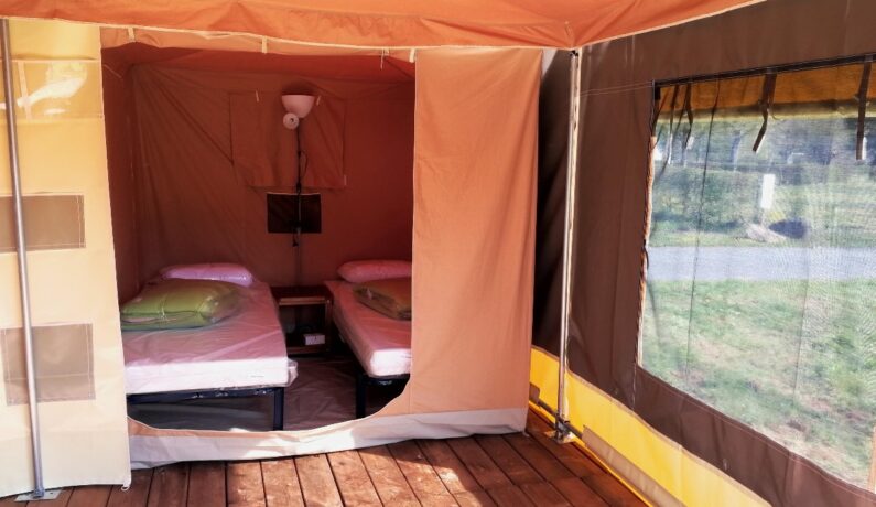 Situés dans l’enceinte de la Base de loisirs, au cœur du village de Pont-d’Ouilly, les bungalows toilés