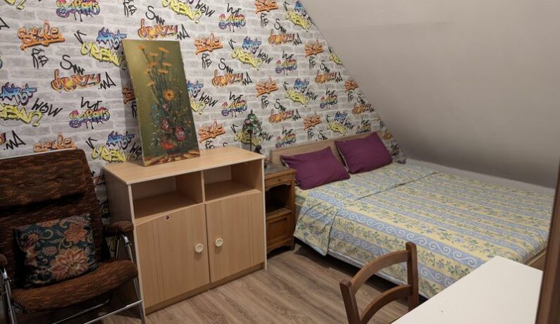 La chambre, située au premier étage, comprend un lit double et un lit simple. Une salle de bain ainsi que des WC réservés aux hôtes se trouvent sur le palier. Une cuisine est également à votre disposition pour un séjour en toute autonomie.