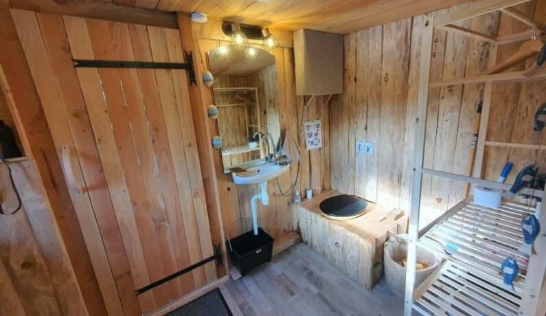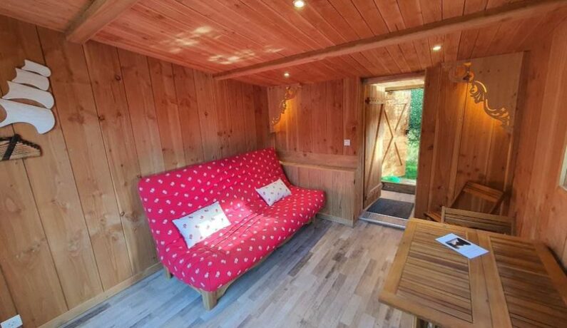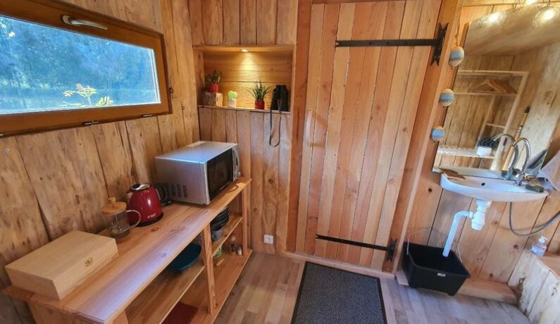 L’atmosphère chaleureuse du bois, la décoration sobre et raffinée offrent un espace à la fois cosy et respectueux de l’environnement. La cabane est équipée de toilettes sèches et d’un lavabo, pour la douche vous aurez accès à la salle de bains de la maison. Un clic-clac confortable vous procurera une vue reposante sur l’étang, vous pourrez aussi vous installer sur le ponton devant la porte-fenêtre avec la table et les chaises à disposition.