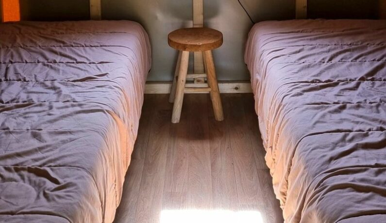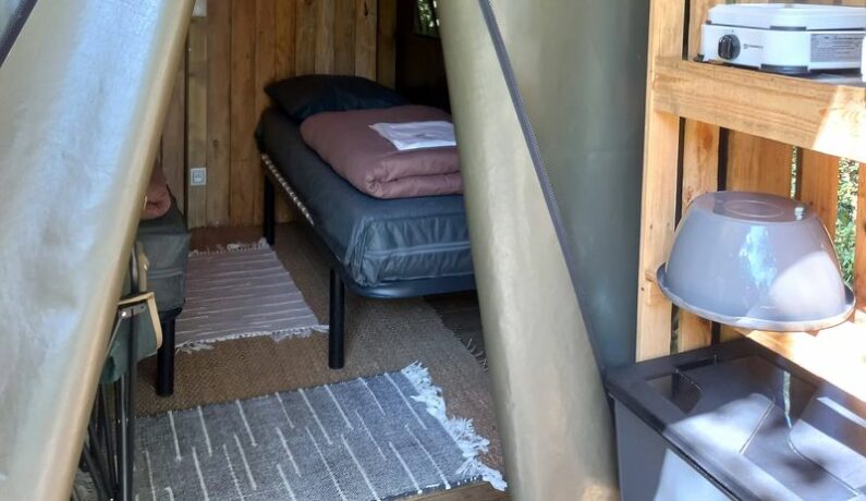 4 tentes « cyclo Suisse normande » pour 2 personnes sont disponibles sur le camping – réservation à la nuitée possible pour les randonneurs du Tour de la Suisse Normande et les cyclo touristes de la Vélo Francette. Matériel à disposition : 2 lits (matelas 80/190) avec 2 couettes 140×190, 2 oreillers et 2 couvertures fournis, 2 chaises pliantes, table, 1 réchaud à gaz, glacière à disposition, vaisselle (assiettes, couverts, verres, casserole, poêle) – Une terrasse couverte – garage à vélos couvert . Non fournis : produits d’entretien , éponge, torchon. (Location de draps possible)- avec électricité – bloc sanitaire collectif à 50 m. Possibilité de garer un véhicule sur l’emplacement de la tente.
