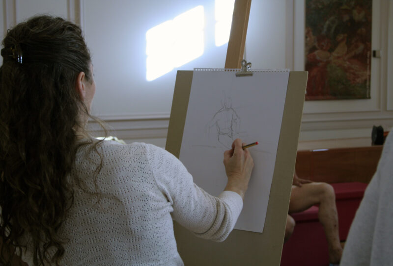 Cours de dessin dispensé par Alexandrine Gautier, artiste plasticienne. Chaque séance aborde un thème et l’enseignante s’adapte à chaque élève. Thème du samedi 19 juillet : dessin sur le motif.