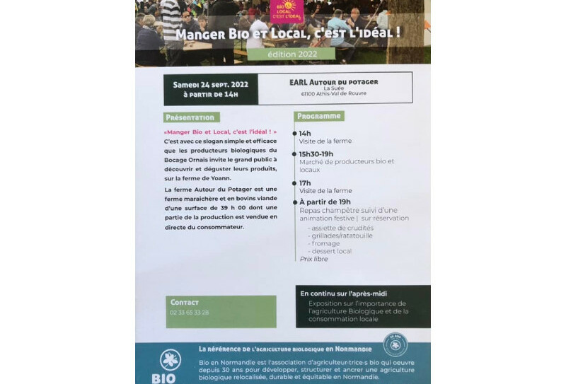 C’est avec ce slogan simple et efficace que les producteurs biologiques du Bocage Ornais invitent le grand public à découvrir et déguster leurs produits, à la ferme de Yoann. La ferme Autour Du Potager est une ferme maraichère et en bovins viande d’une surface de 39 hectares, dont une partie de la production est vendue directement au consommateur.
