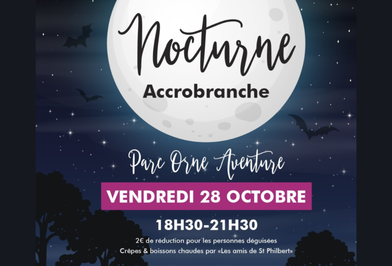 Soirée Nocturne Accrobranche organisée au parc Orne Aventure dans le cadre du week-end d’Halloween. Crêpes et boissons chaudes par « Les amis de St Philbert ». Réservation obligatoire auprès des organisateurs et une réduction de 2€ pour les personnes venant costumées.