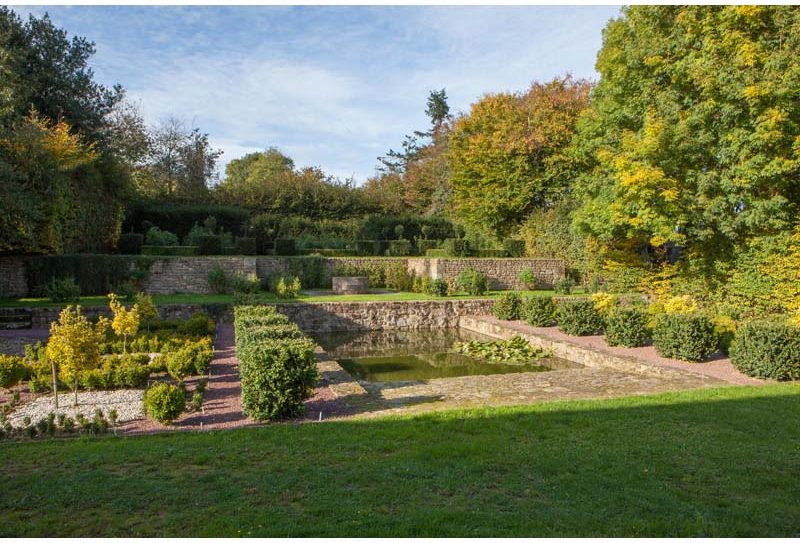 Jardins Renaissance autour d’un manoir du XVIe s. Terrasses à l’italienne. Roseraie. Miroir d’eau. Broderie de buis.